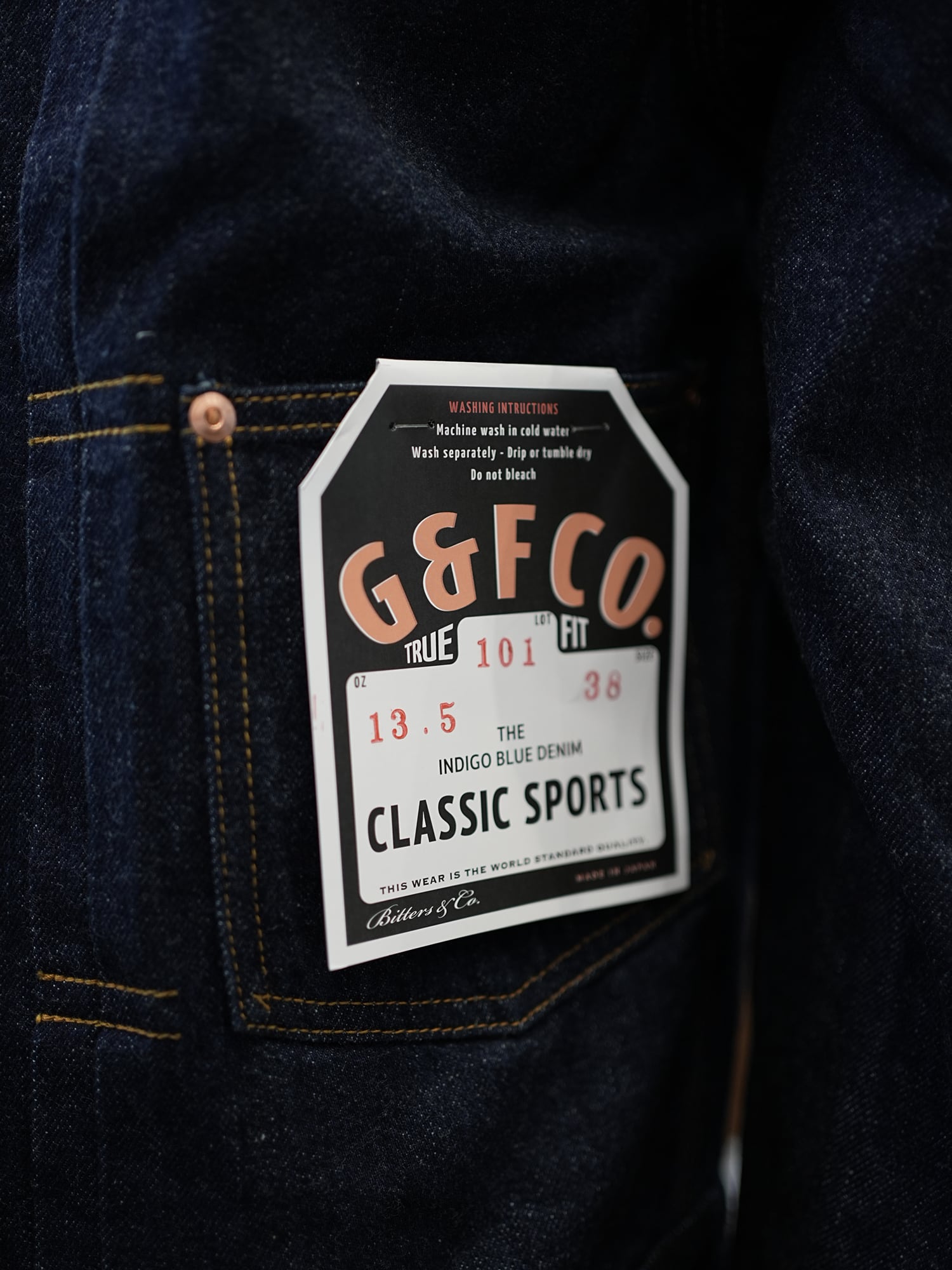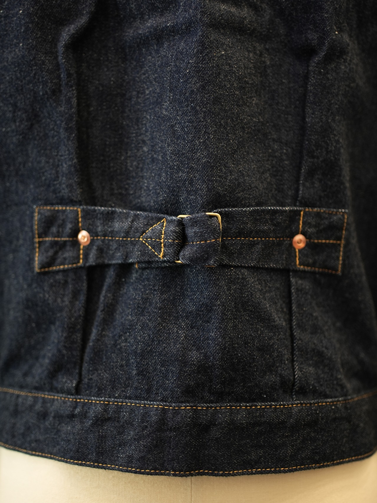 13.5ozとやや厚手のミドルトーンのインディゴブルーセルビッチデニムジャケット。