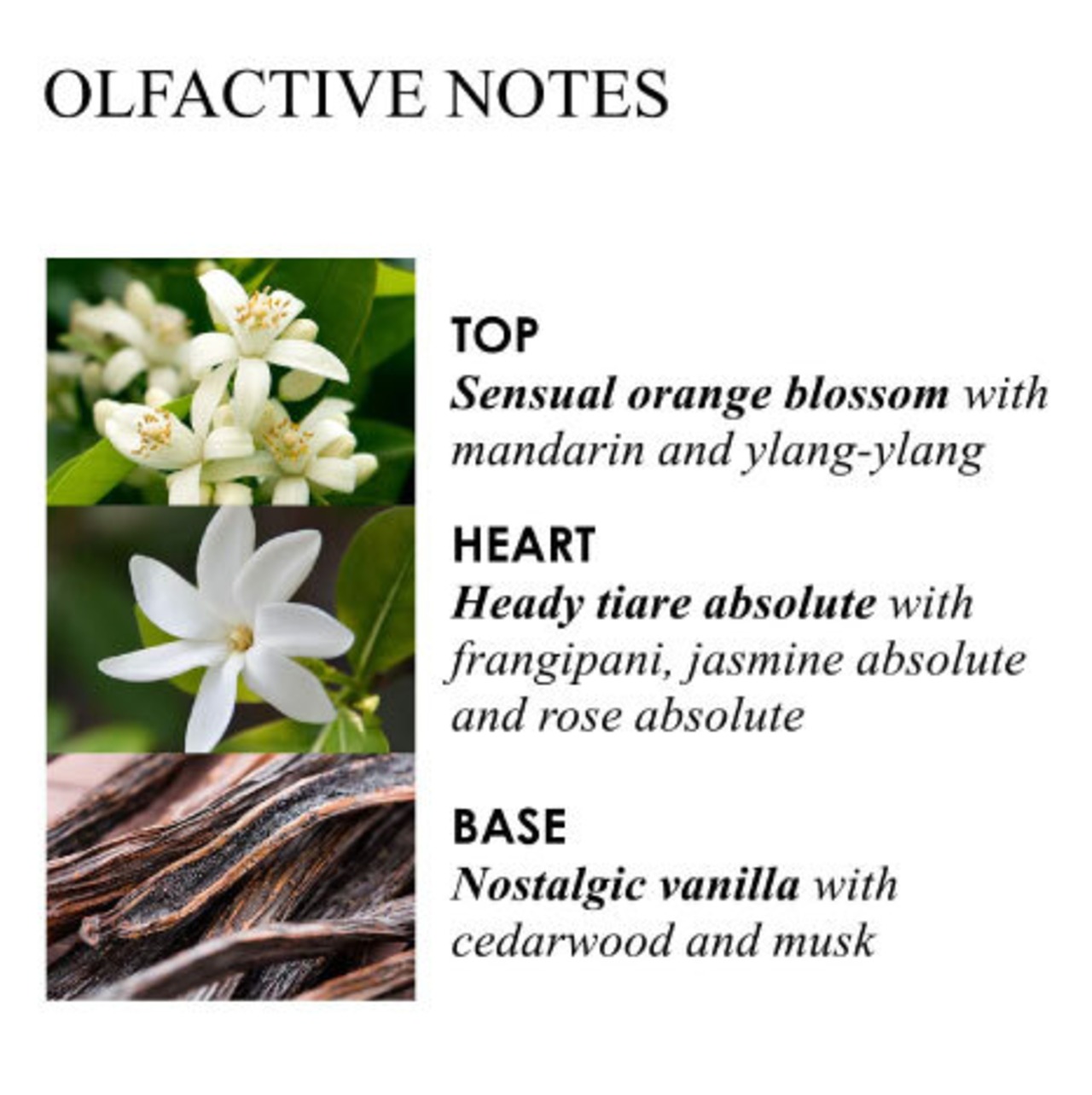 コレクションのオーバーアーチングノートであるティアレ・アブソリュートは、ティアレタヒチとも呼ばれ、タヒチのシンボルとされる花で、甘くエキゾチックな豊かな香りを放ちます。